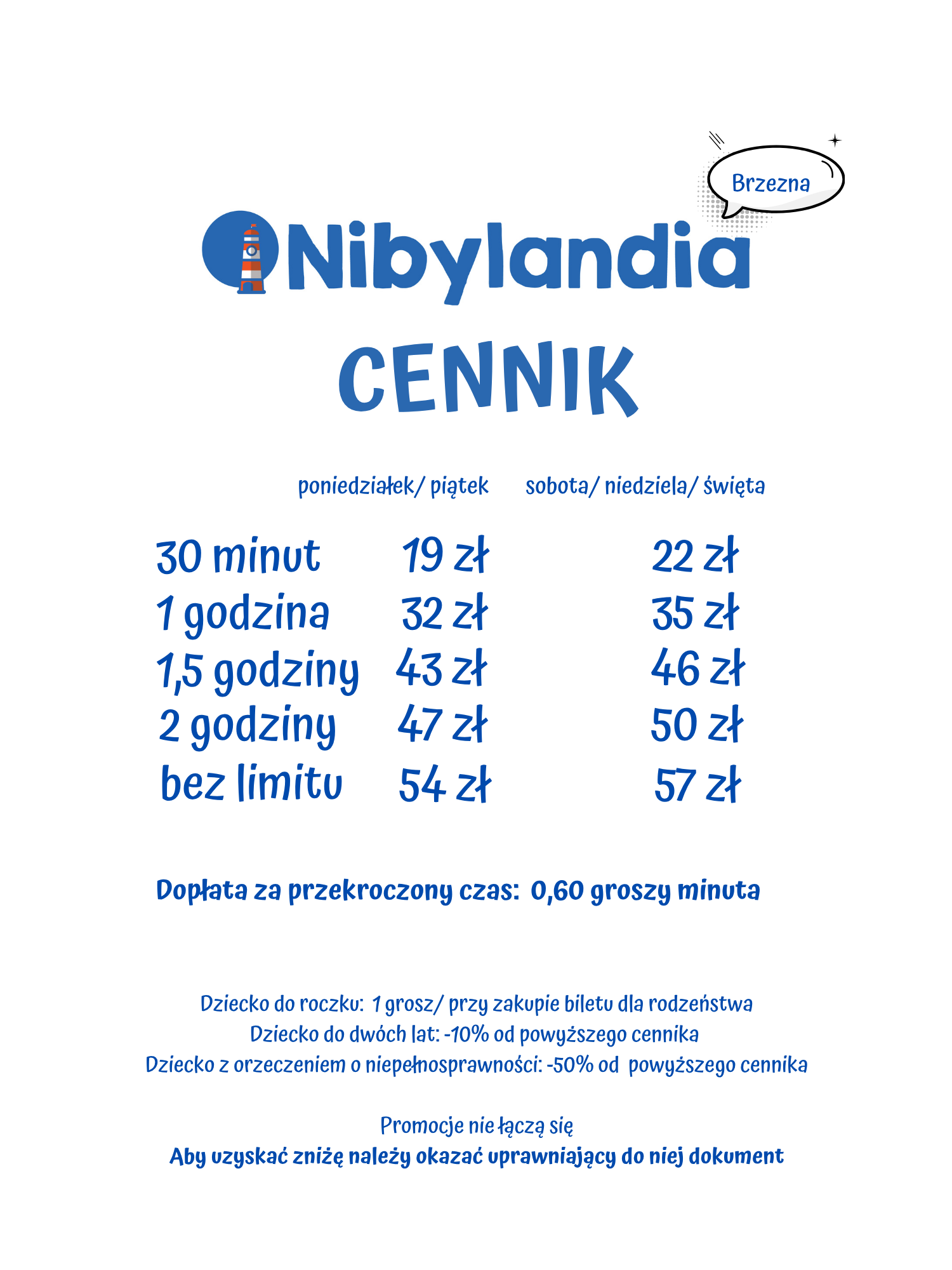 Cennik Brzezna NIBYLANDIA - BRZEZNA Nasz cennik Na nasze Sale zapraszamy po zakupie wejściówki. Możesz do nas zajrzeć o dowolnej porze. Kupując dłuższy pobyt oszczędzasz 🙂 Dorośli nie płacą za pobyt. Płatność dotyczy tylko dzieci w wieku od roczku do jedenastu lat. Zainteresowała Cię nasza oferta? Masz pytania? Skontaktuj się z nami już teraz! PRZEJDŹ DO KONTAKTU