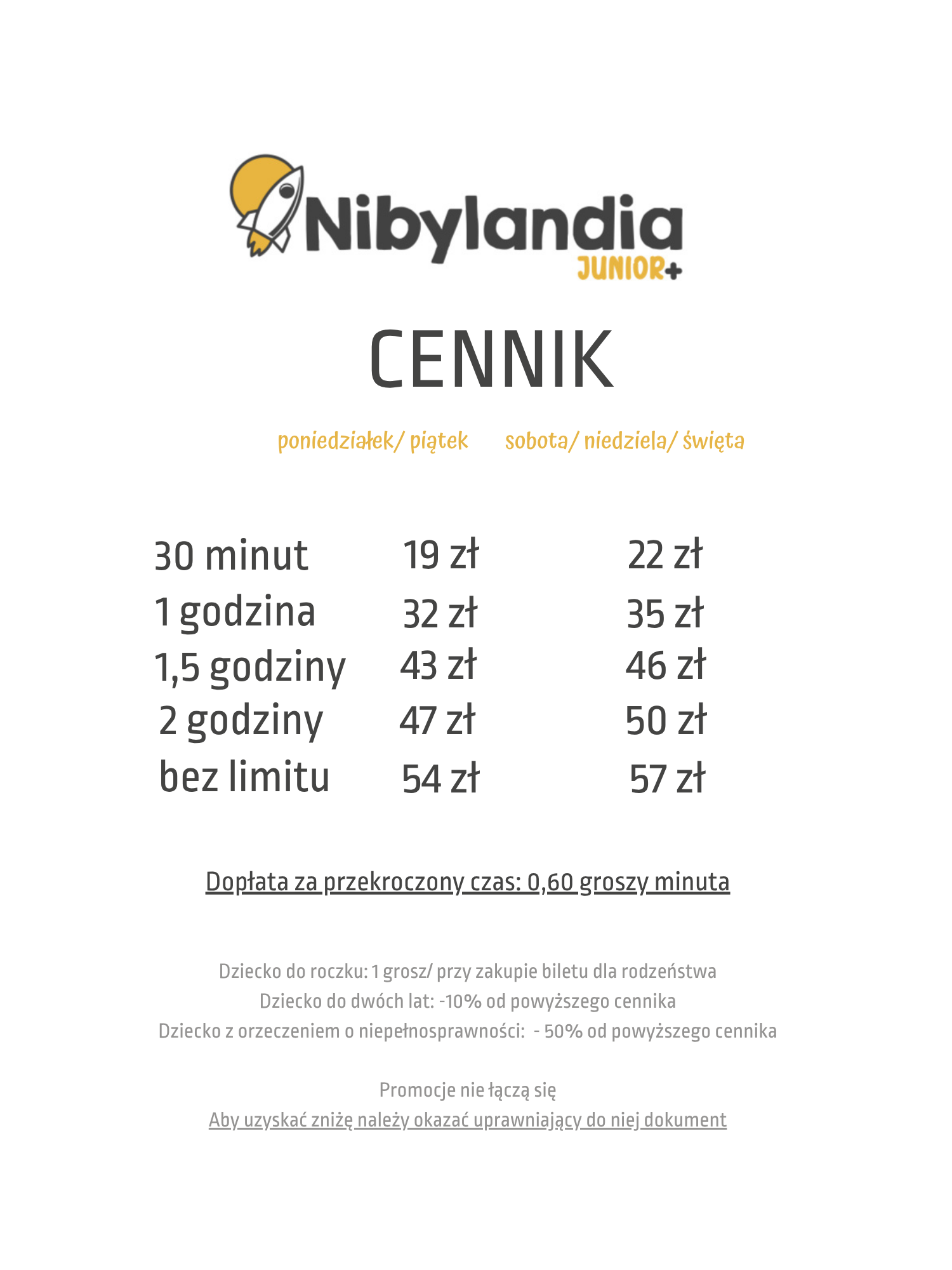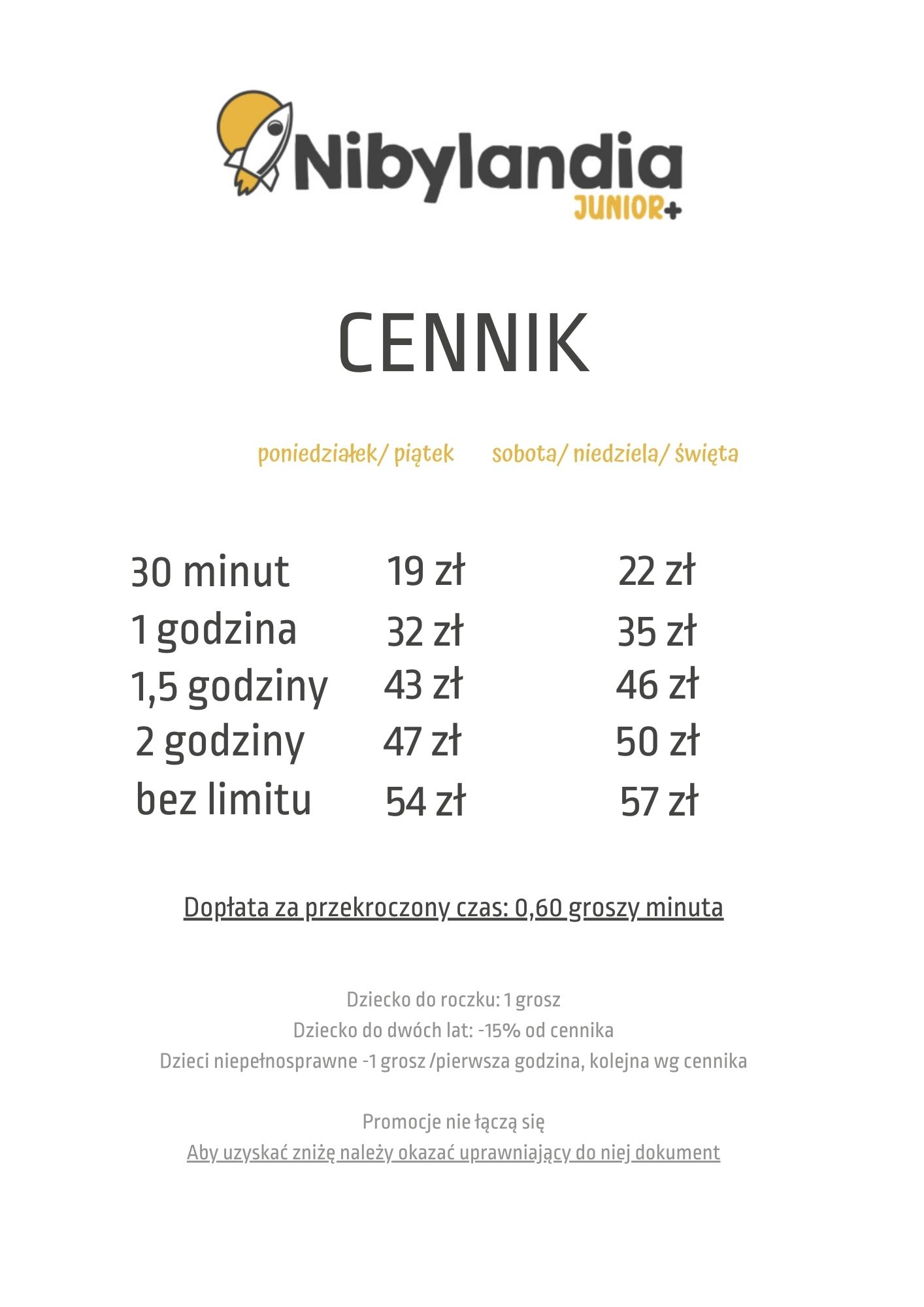 Do Nibylandii Junior+ zapraszamy po zakupie wejściówki. Możesz do nas zajrzeć o dowolnej porze. Kupując dłuższy pobyt oszczędzasz 🙂 Dorośli nie płacą za pobyt. Płatność dotyczy tylko dzieci w wieku od roczku do dwóch lat- bilet z rabatem, starsze do 13 lat pełnopłatne.