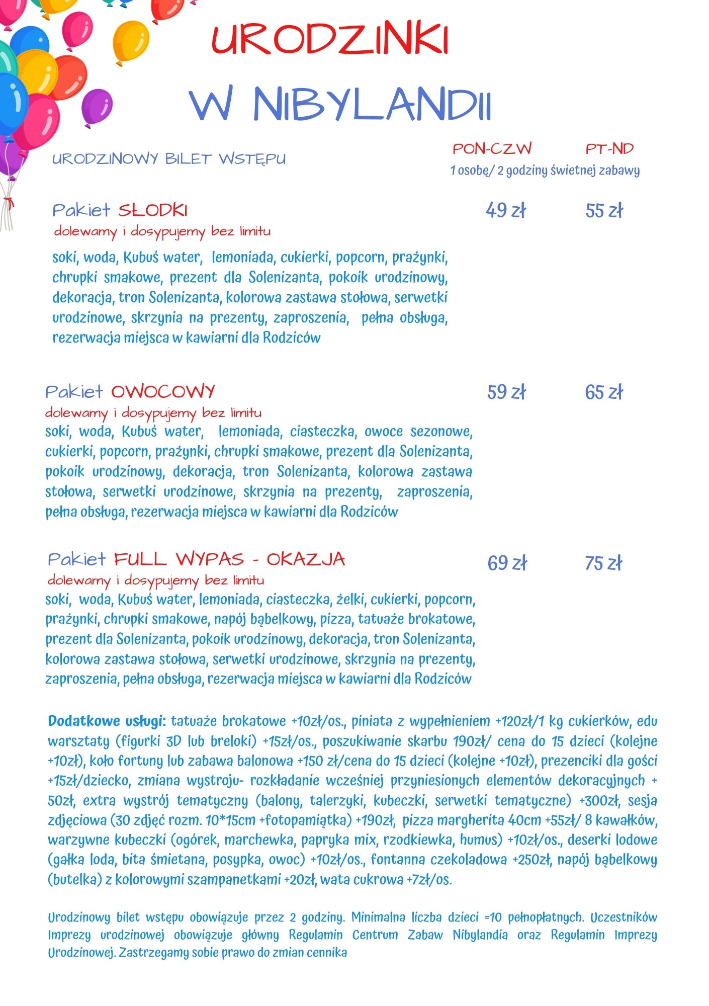 URODZINKI Nowy Sącz NIBYLANDIA - NOWY SĄCZ Dbamy o ten szczególny dzień! Urodzinki to dla nas wszystkich wielka uroczystość. Tak jak Wasze Pociechy tygodniami odliczają dni do świętowania swoich urodzinek, tak i my nie możemy doczekać się i dbamy o każdy szczegół, aby stanąć na wysokości zadania. Zainteresowała Cię nasza oferta? Masz pytania? Skontaktuj się z nami już teraz! PRZEJDŹ DO KONTAKTU